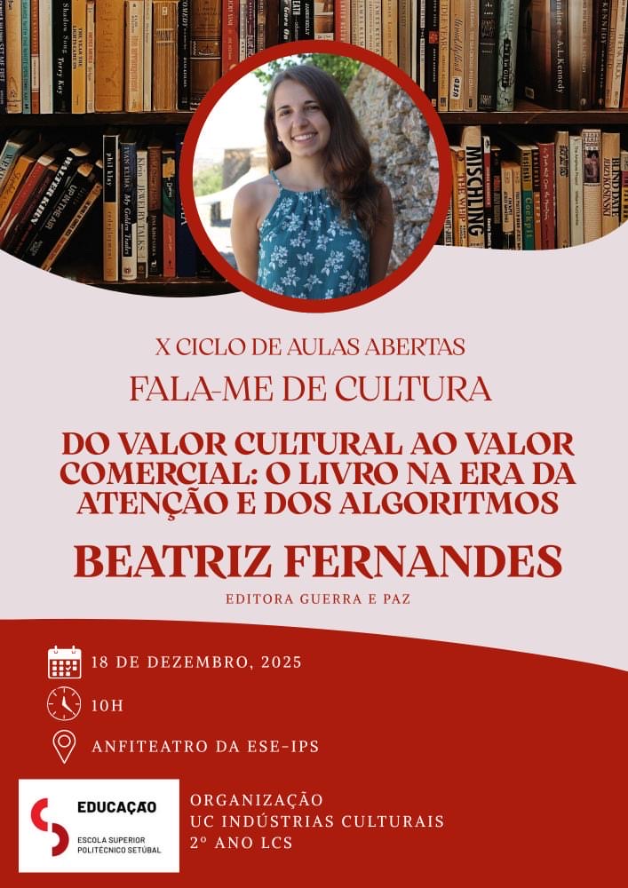 “Do valor cultural ao valor comercial: o livro na era da atenção e dos algoritmos” é o título da quarta sessão do X Ciclo de Aulas Abertas Fala-me de Cultura. A aula será lecionada por Beatriz Fernandes, responsável pelo Marketing Digital do Grupo Guerra e Paz Editores, que falará o lugar do livro e das editoras no cenário digital contemporâneo.