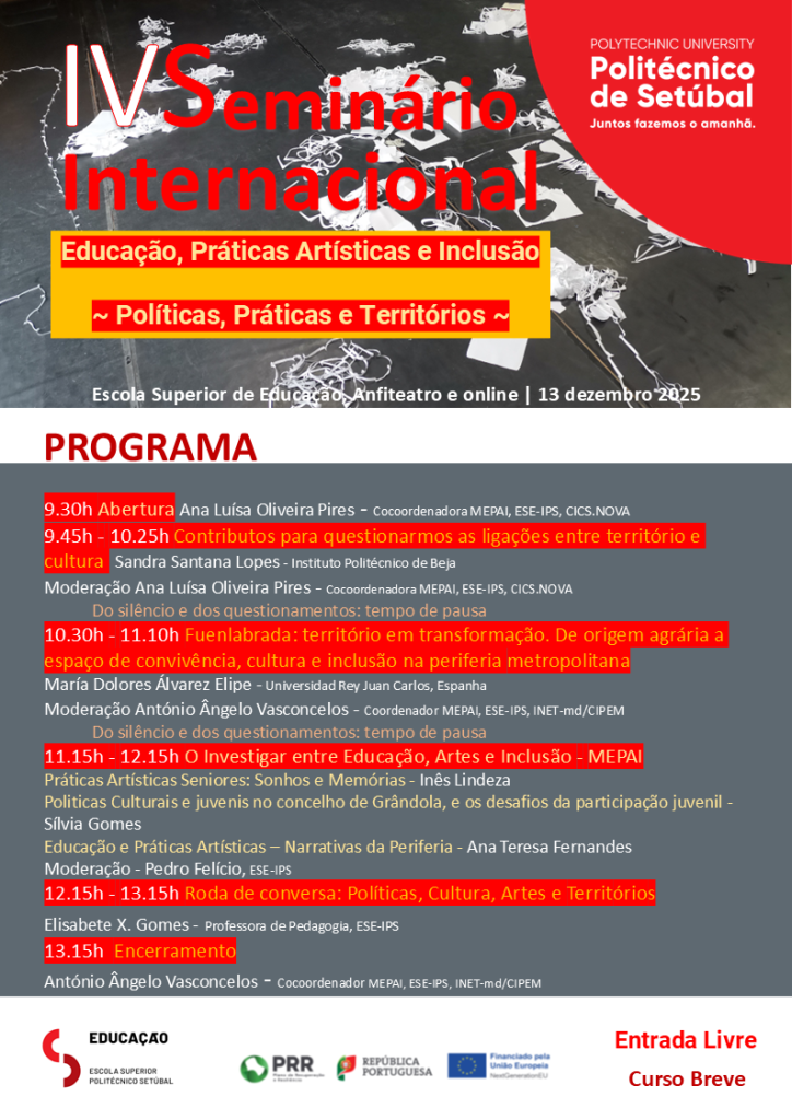 IV Seminário, presencial e online que é aberto a todos e a todas que se interessam por esta relação Educação-Práticas Artísticas-Inclusão-Territórios.