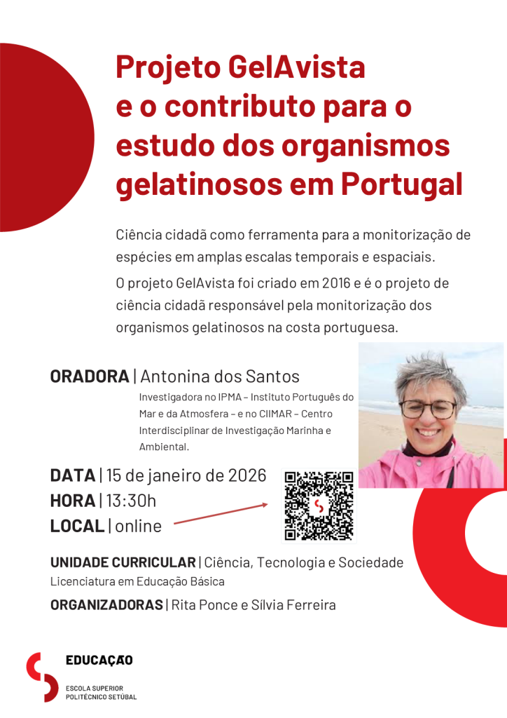 As docentes da UC Ciência, Tecnologia e Sociedade convidam a comunidade escolar a vir debater este tema com a nossa convidada: Antonina dos Santos é investigadora no IPMA – Instituto Português do Mar e da Atmosfera – e no CIIMAR – Centro Interdisciplinar de Investigação Marinha e Ambiental. É doutorada em Biologia pela Universidade de Lisboa e tem mais de 20 anos de investigação sobre taxonomia e ecologia de invertebrados marinhos. É coordenadora do projeto GelAvista, que criou em 2016.