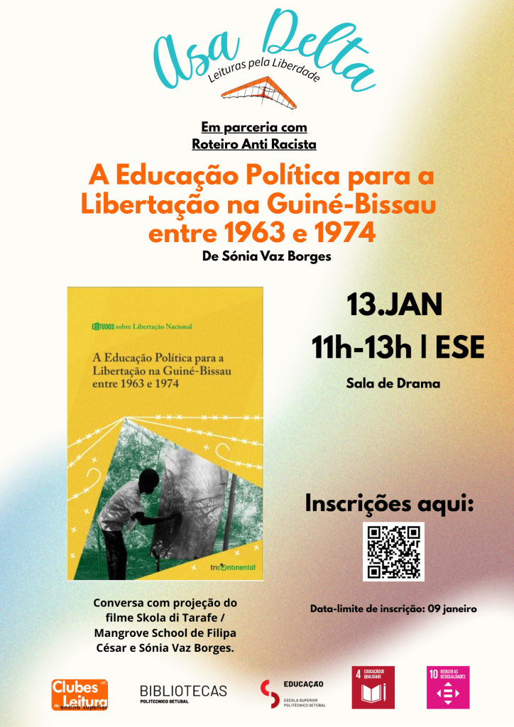 Para iniciar o programa desta 6ª edição há uma novidade: um grupo de leituras antirracistas. Em colaboração com o ASA DELTA: Leituras para a Liberdade, arrancamos com uma conversa sobre o livro A Educação Política para a Libertação na Guiné-Bissau entre 1963 e 1974, de Sónia Vaz Borges e do Instituto Tricontinental de Pesquisa Social, e a projeção do filme Skola di Tarafe / Mangrove School, de Filipa César e Sónia Vaz Borges.