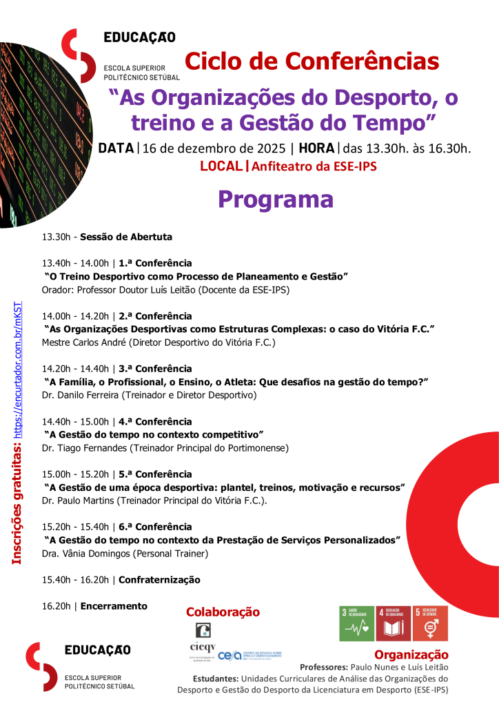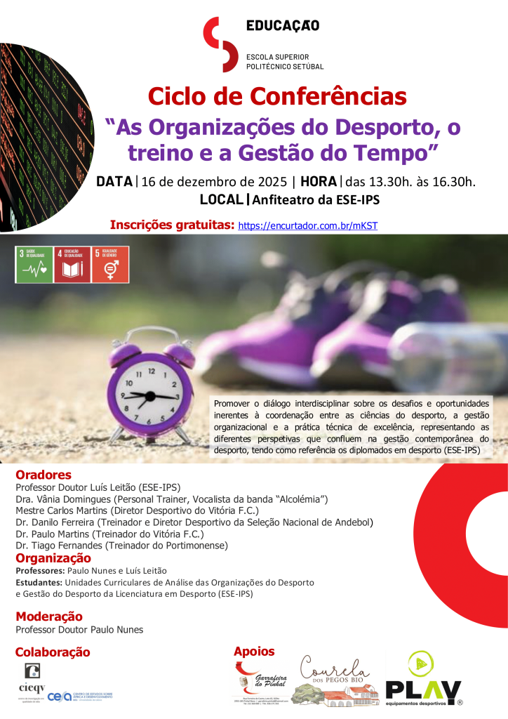 Ciclo de Conferências: As Organizações do Desporto, o Treino e a Gestão do Tempo Categorias Eventos Data 05/12/2025 16 dezembro, 13h30 às 16h30, Anfiteatro ESE Partilhar: